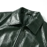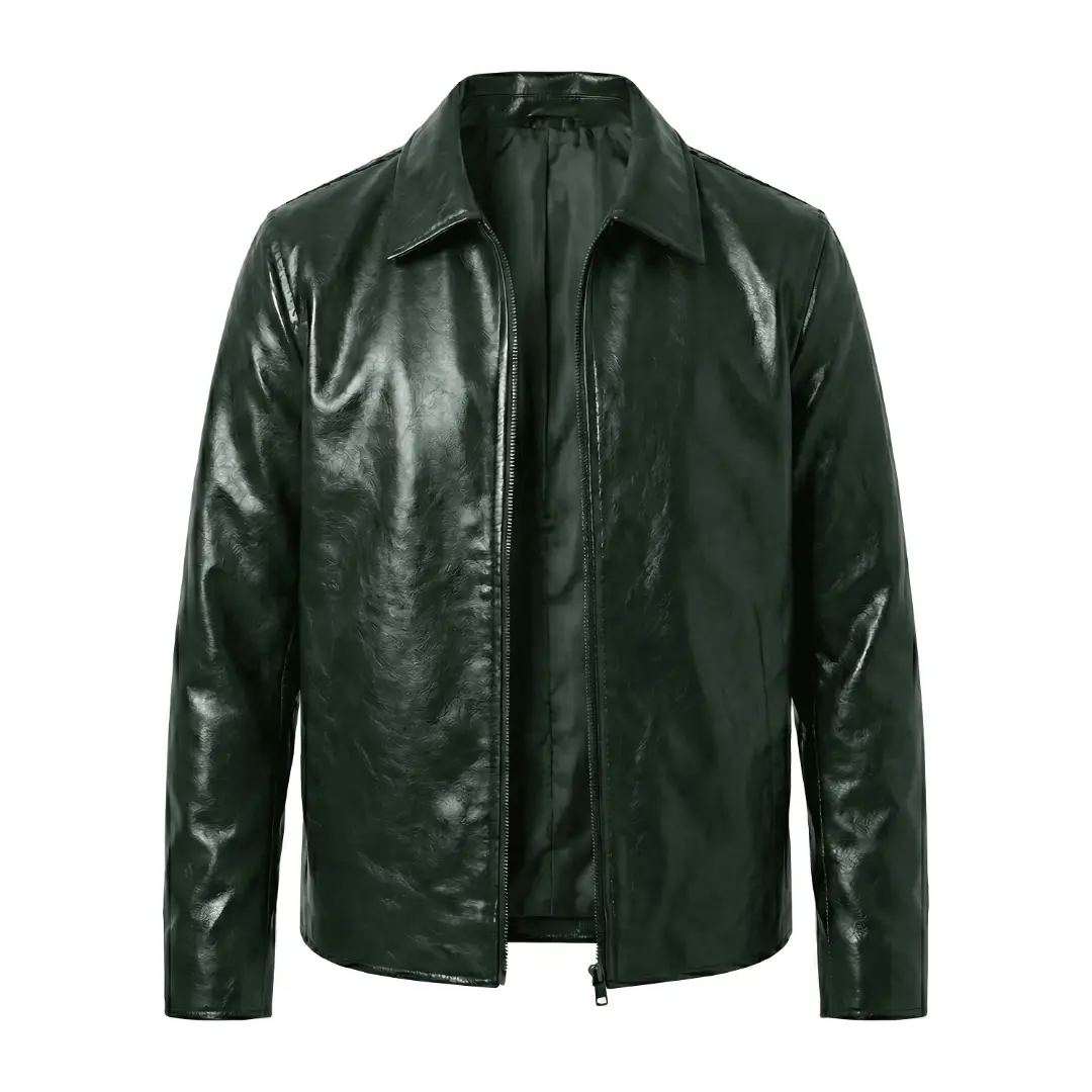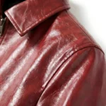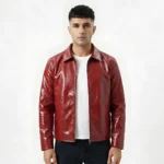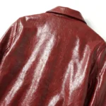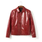 Crafted from premium red leatheroid, this jacket features a mostly smooth surface with a subtle texture that adds depth without overpowering the design. Its clean, minimal construction allows the bold color to stand out while maintaining a refined and wearable silhouette.